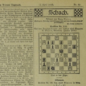 Heute blicken wir auf einen besondere Zeitungsmeldung zurück, und zwar auf eine, die am 1. April 1910 im Neuen Wiener Tagblatt erschien. In dieser Meldung wird –nahezu beiläufig – von einer inzwischen legendär gewordenen Partie berichtet, die sich damals in den Wiener Schachhäusern zugetragen haben muss. Es handelt sich um eine Kurzpartie zwischen dem Namensgeber unseres Klubs, Richard Réti, und dem legendären Schach-Aphoristiker Savielly Tartakower.