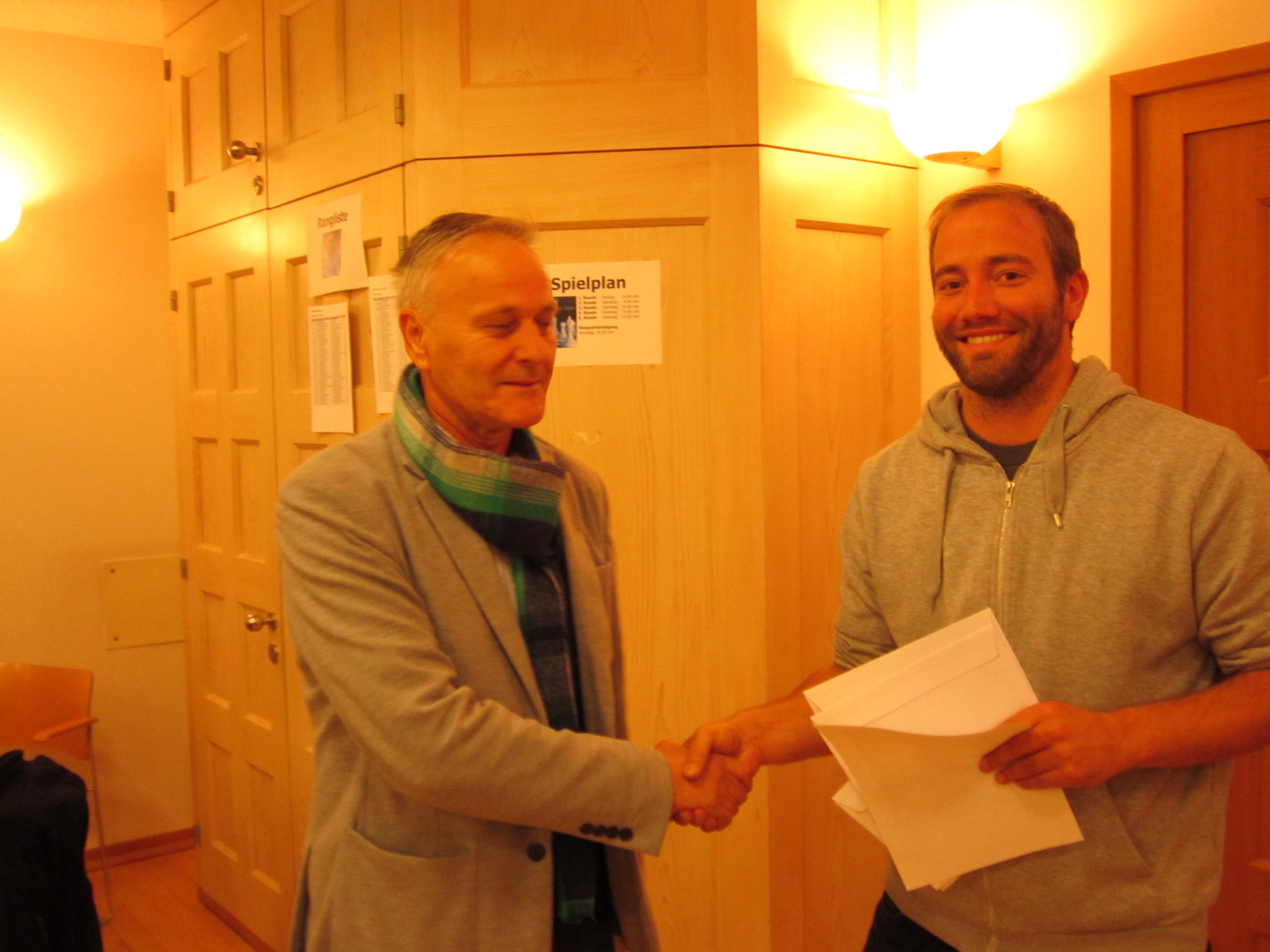 Turnierleiter Roman Schnelli überreicht den ersten Preis an Turniersieger FM Sergejs Grmovos