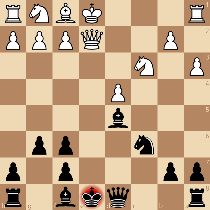 An Brett 2 versucht Linus eine, wie er es mir gegenüber nachher bezeichnet, sogenannte «Figine», was vermutlich am besten mit «Trickli» zu deuten wäre: Sein Springer auf f6 zieht ab nach h5 und greift mit Le7 und Dd8 den nur einfach vom Springer auf f3 gedeckten Läufer zweifach an. Nur: Im Turnierschach sind Tricks grundsätzlich schlechte Ideen, da davon auszugehen ist, dass der Gegner nicht reinfällt, also spielte unser aktueller Klubmeister eben Hope Chess statt Real Chess. Folglich: Positionelle Schwächen und schliesslich Partieverlust.